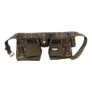 Cinturón de herramientas de cuero marrón de la marca Rolson, diseñado para profesionales. - Doble costura reforzada para mayor durabilidad. - Remaches reforzados para asegurar las uniones. - Soporte para llave de andamio. - Bolsillos para lápices.