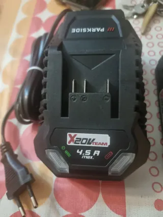 Cargador para baterías Parkside X20V TEAM. - Voltaje: 20V. - Corriente máxima: 4.5 A. - Indicadores LED de carga. - Incluye cable de alimentación.