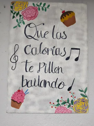 Tablero decorativo pintado a mano con un diseño alegre y festivo, perfecto para añadir un toque especial a celebraciones. - Frase Que las calorías te pillen bailando. - Ilustraciones de flores y cupcakes. - Base de madera con acabado envejecido. Listo para poner en tu mesa de chuches en cualquier celebración 🥳