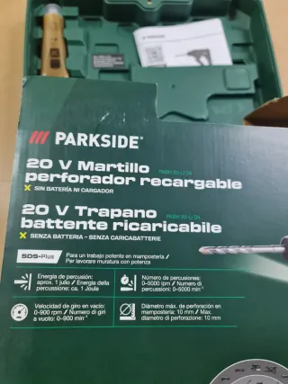 Taladro percutor inalámbrico Parkside, ideal para trabajos de bricolaje y construcción. - Incluye batería de 20V. - Cargador rápido. - Maletín de transporte. - Manual de instrucciones. - Tubo de grasa para el mecanismo.