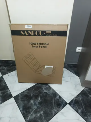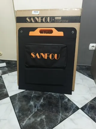 Panel solar portátil SANFOU de 100W, ideal para exteriores. - Diseño plegable y compacto. - Asa naranja para fácil transporte. - Logo SANFOU visible en la bolsa frontal y su cable. Cómo nuevo solo una par de uso, no hago envíos solo recogida en mano