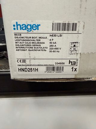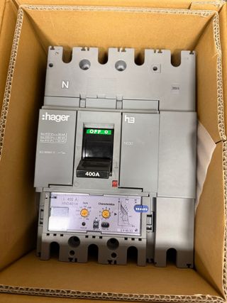 Interruptor automático de caja moldeada Hager H630. - Modelo: HND401H - Capacidad: 400 A - Tensión nominal: 415 V - Corriente nominal: 50 kA - Cumple con la norma IEC 60947-2