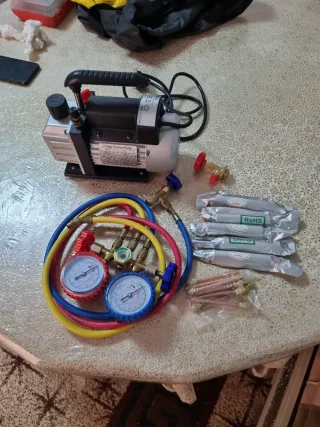 Kit de bomba de vacío con manómetro y accesorios. - Bomba de vacío. - Juego de manómetros con mangueras de colores (rojo, azul, amarillo). - Adaptadores de cobre. - Válvulas.