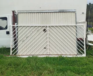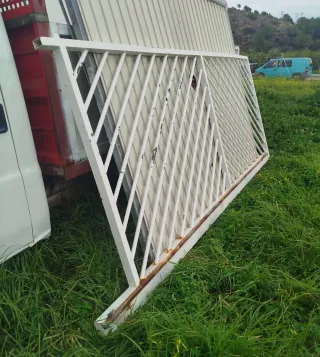 Puerta corredera de metal con un diseño de barras diagonales. Es de color blanco y tiene un aspecto industrial. Medida 3,50 de ancho por 1, 60 de alto - Estructura de metal. - Barras diagonales. - Color blanco. Teléfono 690354315