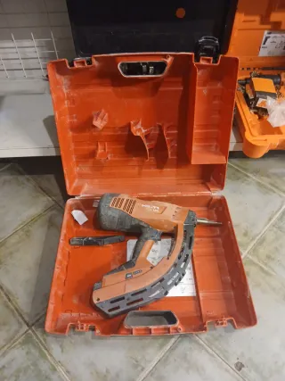 Clavadora a gas Hilti en su maletín. - Maletín de transporte naranja. - Herramienta Hilti para fijaciones.