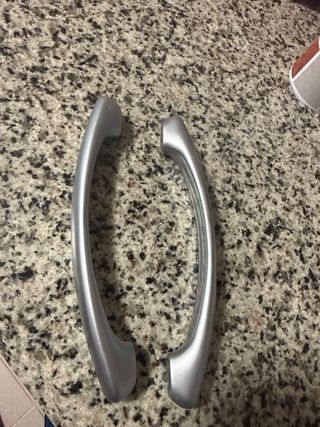 Dos tiradores de puerta plateados con un diseño curvo y moderno. Son ideales para dar un toque elegante a tus muebles o puertas. - Color: Plateado - Material: Metal - Diseño: Curvo