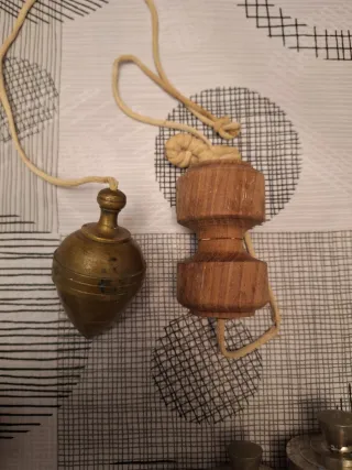 Herramienta de construcción clásica. - Plomada de latón con cuerda. - Plomada de madera con cuerda.