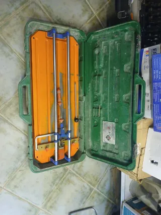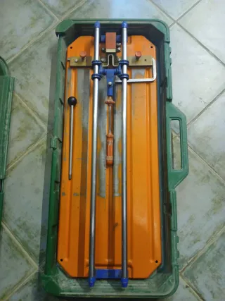 Cortador de azulejos Rubi en su maletín. - Base naranja. - Guías metálicas. - Modelo TS - 60 - Mango azul.