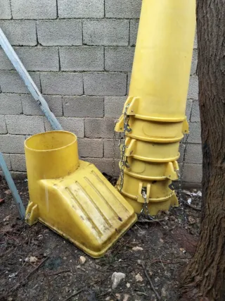 Tobogán de escombros de color amarillo, ideal para trabajos de construcción o reformas. - Fabricado en plástico resistente. - Diseño curvo para facilitar el deslizamiento. - Conexiones para apilamiento. 6 conos de metro y la vertedera