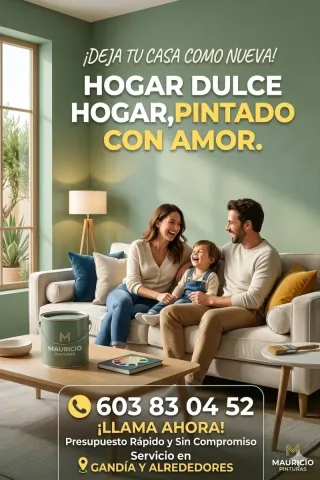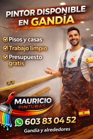 🎨 ¡Hola! Soy Mauricio. ¿Le damos una nueva vida a tu hogar? 🏠✨ Me encantaría ayudarte a que tu casa luzca impecable. Trabajo con mucho mimo, detalle y limpieza, cuidando cada rincón como si fuera mío. 😊 ✅ Mis servicios: Pintura de interior y exterior (pisos, chalets). Fachadas, terrazas y techos. Reparación de humedades y grietas. Puertas y acabados profesionales. 🌟 ¿Por qué confiar en mí? Presupuesto GRATIS y sin compromiso. Limpieza total: ¡ni notarás que estuve allí! Puntualidad y trato muy cercano. 📍 Servicio en Gandía y alrededores. 📞 ¡Hablemos! Estaré encantado de atenderte: 👉 603 83 04 52 (WhatsApp o llamada)