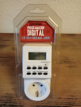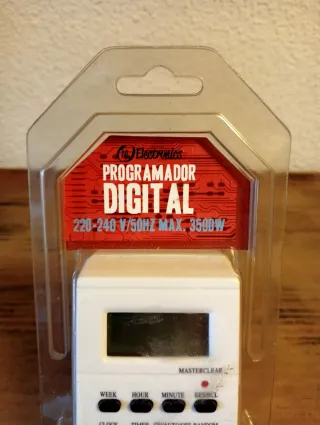 Programador digital NL Electronics. Permite programar el encendido y apagado de aparatos eléctricos. - Voltaje: 220-240 V. - Frecuencia: 50 Hz. - Potencia máxima: 3500 W ON / OFF 128 programas en una semana Programador recargable con batería NI - MH Instrucciones de uso