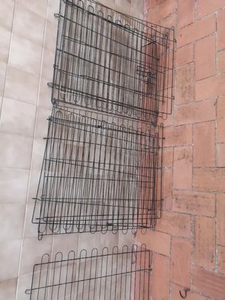 Conjunto de 8 rejas metálicas de color negro, ideales para diversos usos. - Medidas aproximadas: 70 cm de alto x 55 cm de ancho. - Fabricadas en alambre metálico. - Diseño con múltiples barras horizontales y verticales.