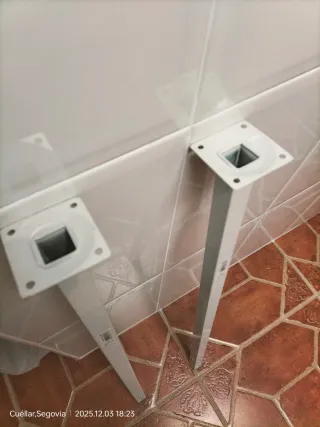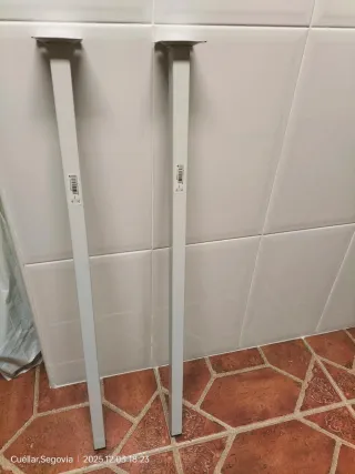 Se venden dos patas metálicas, ideales para montar o reparar una mesa o balda. Tienen una base de 6cm para ser atornilladas. - Medidas: 80cm de largo y 2,5cm de ancho - Material: Metal - Color: Blanco - Diseño: Recto y moderno