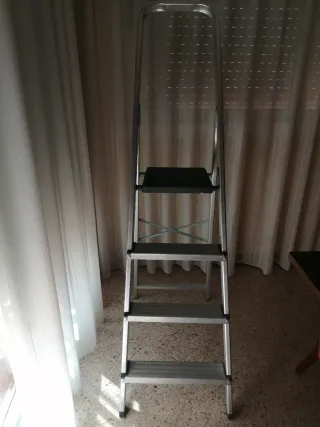 Escalera plegable de aluminio con 4 peldaños. No se hace envío, venta en persona. - Altura peldaño más alto (escalera abierta): 80 cm - Altura total plegada: 140 cm