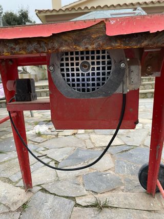 Sierra circular de mesa industrial Motor muy potente En la placa se ve: • 2.9 kW • 3000 rpm • trifásico 400V La mesa y el chasis que se ven son: • acero grueso • patas robustas • motor colgante Esto es típico de maquinaria de carpintería profesional. Disco grande usa disco grande 350 mm Eso permite: • cortar tablas gruesas • cortar vigas • más precisión. Las domésticas su - Motor trifásico. - Estructura robusta de metal rojo. - Protector de motor con rejilla. Si venis a buscarla 400 euros