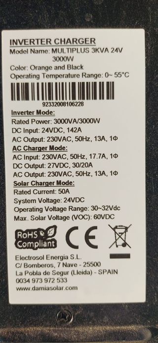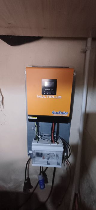 Por ampliar instalación, vendo equipo fotovoltaico: inversor/cargador, baterías, paneles solares y cuadro de protecciones. Características: • Inversor: Multiplus Ecosolar 3KVA 24V 3000W. Salida 230V. • 4 baterías gel Ecosolar 250Ah C100. • 4 paneles solares Ecosolar Advanced 340W 24V alto rendimiento, 2 x 1 m. • Protecciones: entrada paneles, alimentación generador y salidas AC 230 V. Características de la instalación, inversor y paneles en foto. Ampliable hasta 3kW. Precio de compra en 2020/21: casi 3000 €. Lo vendo por 1000. Ideal caseta campo para iluminación y nevera. No envíos por Wallapop (ver condiciones envio voluminosos).