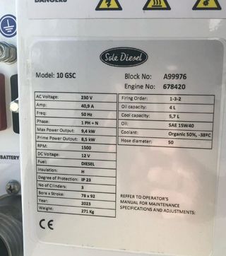 Grupo electrógeno Solé Diesel 10 GSC El 10 GS/GSC es un grupo electrógeno marino monofásico montado en un bloque motor Mitsubishi de 3 cilindros. Este generador desarrolla una potencia de 9,40 kW - 9,40 kVA a 1500 rpm y 50 Hz. +IVA