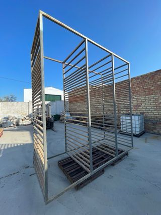 Estructura metálica resistente para la exposición de placas o perfiles. Ideal para almacenaje o presentación en almacenes de materiales de construccion y similares - Medidas aproximadas: 3 mt alto, 3 mt largo y las medidas libres de los huecos para las placas es de 1,20 mt. - Material: Metal resistente. - Estructura robusta y estable. - Perfecto estado, con señales normales de uso.