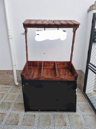 Preciosa caseta de madera para mercadillo, ideal para vender productos, para catering. Es de madera oscura, con un diseño rústico y encantador. - Estructura de madera resistente. - Techo para proteger del sol y la lluvia. - Tres compartimentos para organizar productos. - Desmontable