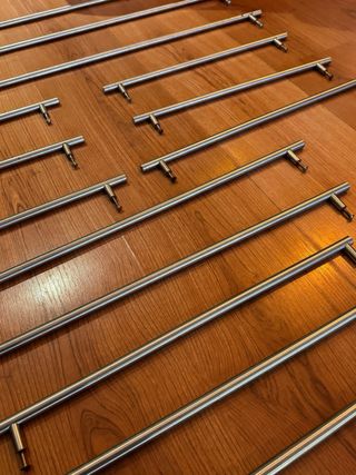 Se venden 19 tiradores de acero inoxidable. Son resistentes y elegantes. Se pueden vender por separado o por lotes, PRECIOS POR SEPARADO EN LA DESCRIPCIÓN - Fabricados en acero inoxidable. - Diseño moderno y sencillo. - Ideales para cajones y armarios. MEDIDAS - 3 unidades de 85cm - 45 euros/pieza - 2 unidades de 55cm - 35 euros/pieza - 2 unidades de 45 cm - 25 euros/pieza - 2 unidades de 43 cm - 22 euros/pieza - 3 unidades de 38cm - 20 euros/pieza - 1 unidad de 38cm con una proporcion diferente - 20 euros/pieza - 1 unidad de 36,5 cm - 20 euros/pieza - 5 unidades de 22cm - 15 euros/pieza precio negociable en lotes