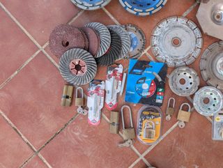 Lote de discos de corte y abrasivos variados. - Discos de diamante para amoladora. - Discos de corte para radial. - Discos de láminas. - Discos de copa. - Candados de seguridad.