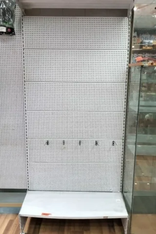 Se venden 14 metros líneales de paneles perforados con patas y balda inferior y 3 mostradores como los de la foto - Paneles perforados de color blanco 14 metros con patas y balda inferior. - 3 Mostradores de madera como el de la foto con zona de exposición - 300 ganchos para paneles