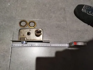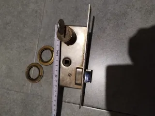 Conjunto de cerradura AZBE con dos embellecedores y SOLO una llave. - Cerradura de metal. - Dos embellecedores circulares de latón. Ver medidas en las fotos