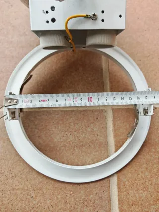 Lote de cuatro focos halógenos para cocina. Son redondos y de color blanco. Precio de 50€ por el lote de los 4. Funcionan con dos bombillas E27 cada uno (bombillas NO incluidas) - Diámetro exterior aproximado: 23 cm. - Diámetro interior empotrable 18 cm