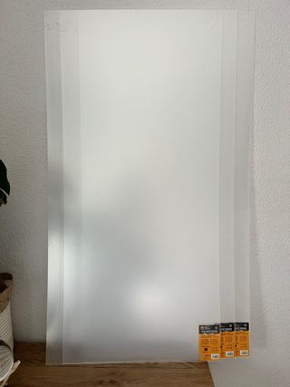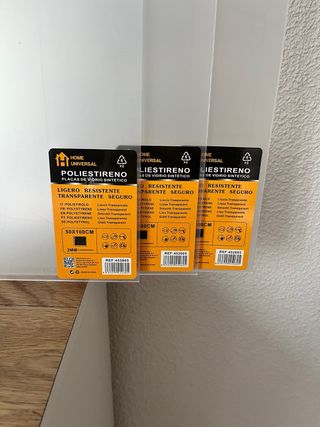 3 planchas de poliestireno de alta calidad, ligeras y resistentes. - Medidas: 50x100cm - Grosor: 2mm - Acabado: Transparente liso -Nuevas sin uso, con protector intacto.