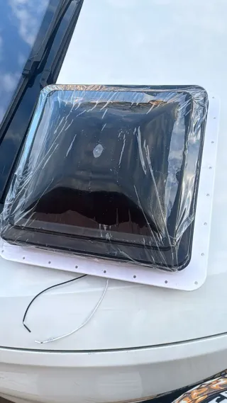 Claraboya de techo de 40x40 cm, sin usar. - Marco exterior blanco. - Cúpula negra. - Incluye cables de conexión. Rja15 es nueva a estrenar pero falta el cacharritos que sube y baja se perdió ideal para Camper caravana autocaravana furgoneta embarcación barco etc