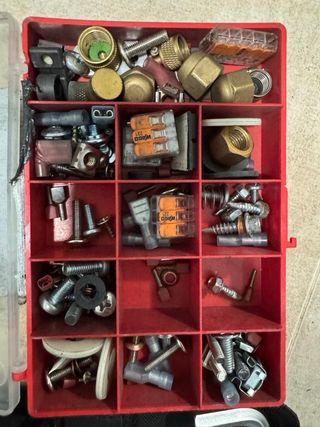Conjunto variado de herramientas y accesorios. - Incluye juego de llaves Allen. - Destornillador con puntas. - Caja de tuercas y tornillos. - Accesorios de fontanería y eléctricos.