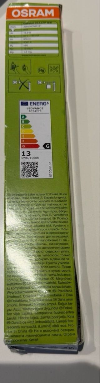 Bombilla fluorescente compacta OSRAM DULUX S/E. Luz Volkswagen california cocina. (2 UNIDADES) - Potencia: 11W - Flujo luminoso: 900 lúmenes - Temperatura de color: 4000K (Cool White) - Casquillo: 2G7 - Clase energética: G - Larga vida útil mejorada