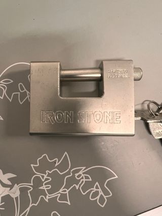 En venta candado de seguridad tipo bloque de la marca Iron Stone, ideal para cortinas metálicas, locales, camiones o portones. • Material: Fabricado en acero sólido endurecido (Hardened Solid Steel) resistente a cortes y palancas. • Seguridad: Cilindro de alta seguridad con 5 llaves de punto originales incluidas. • Estado: Excelente estado estético y funcional, mecanismo suave. • Ventaja: Su diseño de perno oculto minimiza la exposición ante intentos de robo