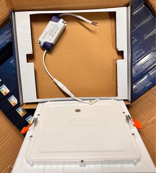Especificaciones Técnicas (por unidad): • Marca/Modelo: Pal SQUARE SuperSlim • Potencia: 18W (Equivale a unos 100W-120W incandescentes) • Luminosidad: 90 LM/W (Total aprox. 1620 lúmenes) • Temperatura de Color: Blanco Neutro (NW 4000K - 4500K), ideal para cocinas, oficinas o baños. • Dimensiones Exteriores: 225 x 225 mm • Medida de Corte (Cutout): 205 x 205 mm • Voltaje: Multivoltaje 85-265V (Funciona estable ante subidas de tensión) • Corriente: 300mA Estado: • NUEVOS • Incluyen su transformador (driver) integrado/externo. Lote 2unds 12€ Downlight", "Empotrable", "Ahorro energético".