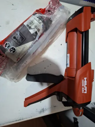 Aplicador manual de adhesivo Hilti HDM 330. - Color naranja y negro. - Diseño ergonómico.