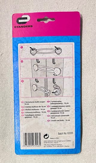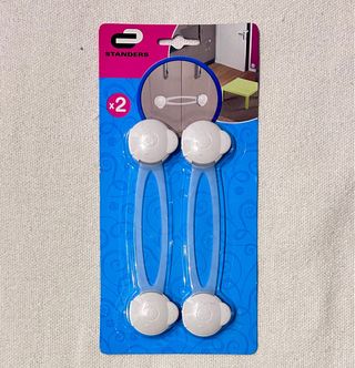 Pack de dos cierres de seguridad de la marca Standers. Son ideales para armarios y cajones. - Color blanco. - Material flexible. - 16 cm.