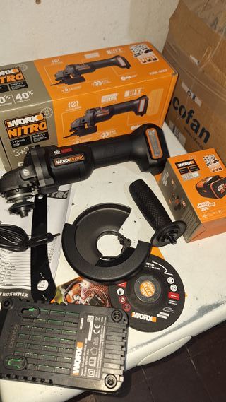 Amoladora angular Worx Nitro WX815 de 20V y 115mm. Incluye batería y cargador. - Motor Brushless. - Mango auxiliar. - Protector de disco. - Disco de corte para metal.