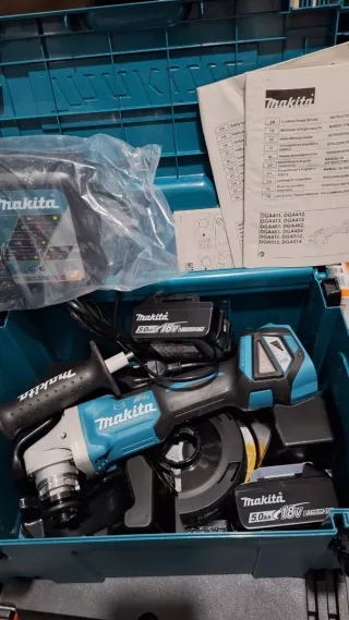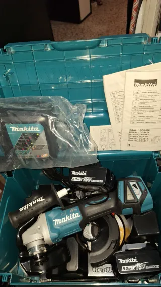 Amoladora angular Makita DGA513RTJ de 125mm. - Velocidad regulable - Incluye dos baterías de 18V y 5.0Ah. - Cargador rápido. - Maletín de transporte. - Manuales de instrucciones.