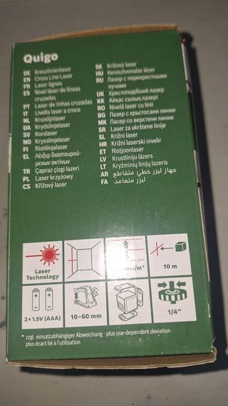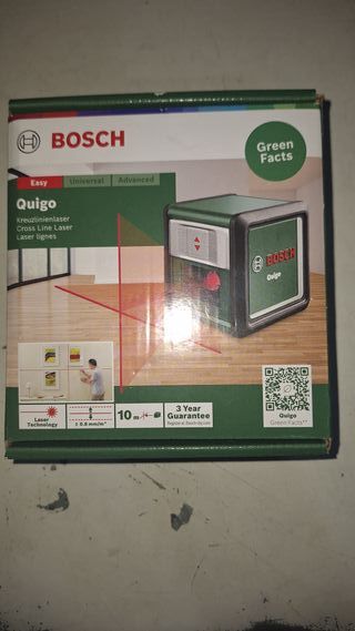 Nivel láser de líneas cruzadas Bosch Quigo. Ideal para proyectos de bricolaje y decoración. - Proyección de líneas horizontales y verticales. - Precisión de ± 0.8 mm/m. - Alcance de hasta 10 metros. - Incluye soporte universal. - 3 años de garantía.