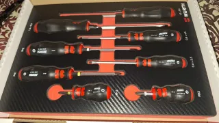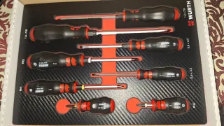 Set de 8 destornilladores de la marca Wurth, organizados en una base de goma eva. - Incluye destornilladores planos y Phillips. - Mango ergonómico de goma. - Marcaje de tamaño y tipo en cada destornillador.