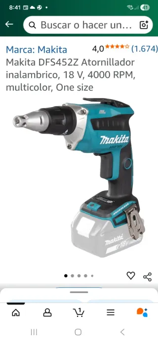 Atornillador de pladur Makita DFS452Z en perfecto estado. Es una herramienta potente y fiable para trabajos de construcción y bricolaje. - Modelo: DFS452Z - Voltaje: 18 V - Velocidad: 4000 RPM - Color: Multicolor - Tipo: Inalámbrico