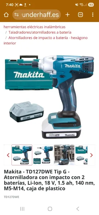 Atornillador de impacto Makita TD127DWE en color azul y negro. Incluye dos baterías. - Modelo: TD127DWE - Voltaje: 18 V - Par máximo: 140 Nm - Tipo de batería: Li-Ion - Capacidad de batería: 1.5 Ah - Incluye caja de plástico. - OJO LAS BATERIAS NO SON COMPATIBLES CON OTRAS HERRAMIENTAS LO SIENTO. SOLO VALEN OARA ESTA.
