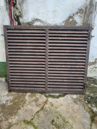 Reja de ventana metálica con diseño de lamas horizontales. Ideal para añadir seguridad y un toque rústico a tu hogar. - Material: Metal. - Color: Marrón óxido. - Diseño: Lamas horizontales.