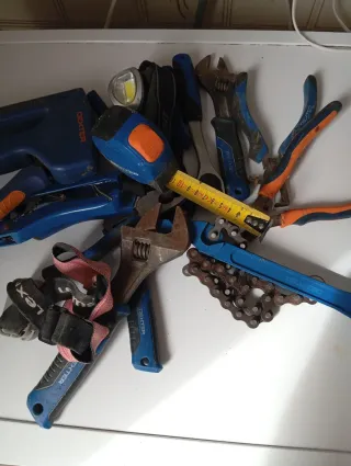 Lote de herramientas de la marca Dexter. - Alicates de corte y presión. - Llave inglesa ajustable. - Cortatubos. - Llave de carraca. - Cadena. - Linternas frontales LED. Algunas son sin usar