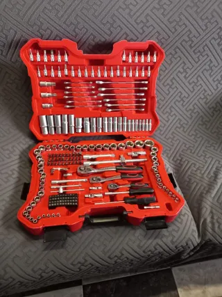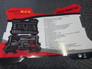 Set de 215 piezas de herramientas KRAFT M.A.N. profesional-line. - Incluye vasos de 1/4, 3/8 y 1/2. - Vasos de tipo E y profundos. - Barras de extensión y deslizantes. - Portabits y juntas universales. - Carracas y mangos giratorios. - Puntas de destornillador y llaves hexagonales. - Puntas de bujía.