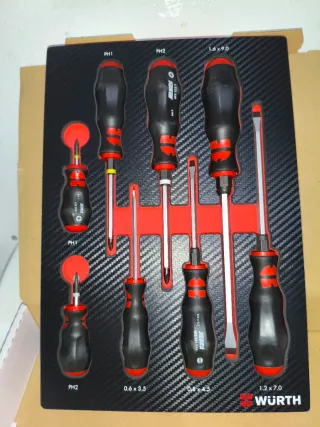 Set de 8 destornilladores de la marca Wurth. - Incluye destornilladores planos y Phillips. - Tamaños: 1.6x9.0, 0.8x4.5, 1.2x7.0, 0.6x3.5, PH1, PH2. - Mangos ergonómicos de color negro y rojo.