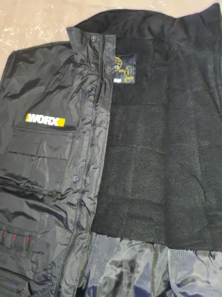 Chaleco negro de la marca Worx con múltiples bolsillos. - Cierre frontal con cremallera. - Cuello alto. - Bolsillos en el pecho. - Bolsillos inferiores.