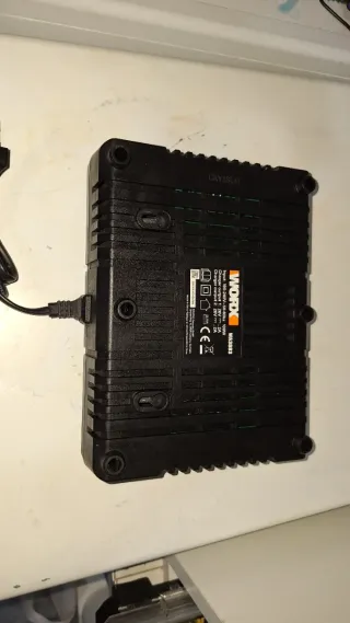 Cargador doble para baterías Worx de 20V, modelo WA3883. Se encuentra en excelente estado, prácticamente nuevo. - Capacidad para cargar dos baterías simultáneamente. - Indicadores LED de estado de carga. - Diseño robusto y compacto.