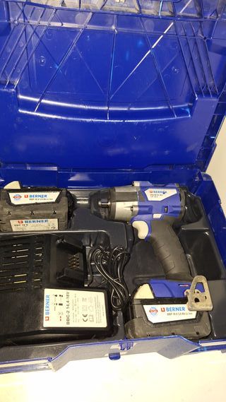 Llave de impacto Berner con una fuerza de 700Nm y un cuadradillo de 1/2 pulgada. Se incluye el cargador y dos baterías con maleta en muy buen estado. - Incluye dos baterías Berner. - Cargador Berner BBC-2 14,4-18V. - Maletín de transporte azul.