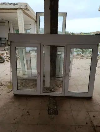 Ventanal de tres hojas con cristales blindados. - Marco de PVC blanco. - Tiradores metálicos.